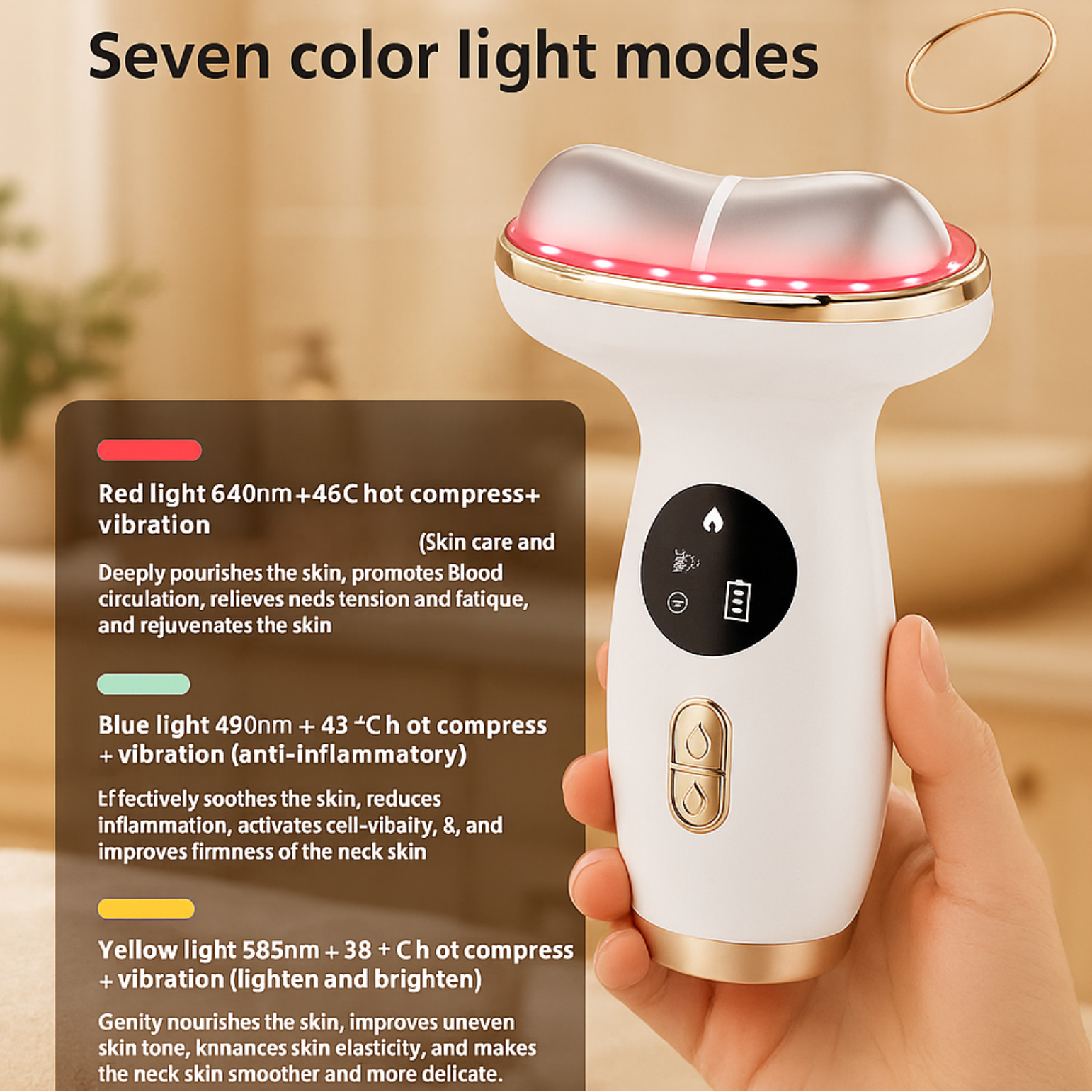 Function: hot & cold dual therapy, vibration massage, neck lifting & firming effect, reduces puffiness, improves skin elasticity, enhances product absorption, brightens and revives dull skin